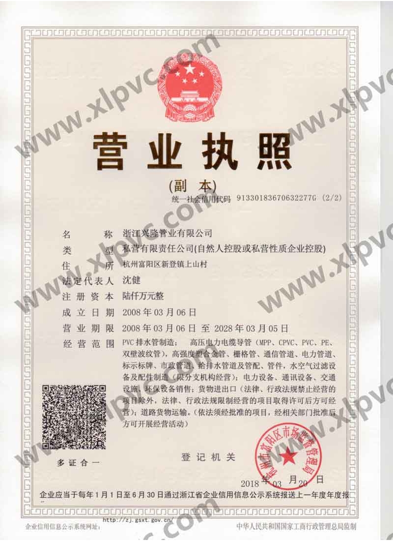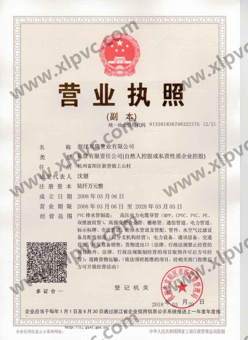 浙江興隆管業(yè)有限公司位于杭州市富陽區(qū)(杭州第九新區(qū)),坐落在新登鎮(zhèn),相距杭州僅60公里,水、陸、空交通運輸十分便利。浙江興隆管業(yè)有限公司前身為富陽興隆塑料制品廠,成立于1992年,2008年改名浙江興隆管業(yè)有限公司,數(shù)十年來,公司一直至力于管道的生產,目前公司擁有國內先進的CPVC保護管生產線,HPVC()雙壁波紋管生產線,多孔管生產線,玻璃鋼電纜保護管生產線、MPP電纜保護管生產線。生產的主要產品有:CPVC電纜保護管、MPP電力電纜保護管(頂管)、高強度塑合金管、HDPE給排水管、HPVC()雙壁波紋管、玻璃鋼電纜保護管、埋地通信用的PVC-U多孔管、PE直壁管、PVC-U雙壁波紋管、梅花管等,年生產能力達20000萬米。